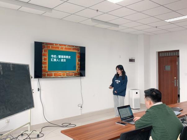 孟吉同学分享的书目是雷恩的著作《管理思想史》,她从本书的写作背景入手,讲解了本书的写作视角、书籍内容、批判与反思以及现实启示等五个方面的内容。在分享时,孟吉同学重点阐述了《管理思想史》的四个管理发展阶段,并简要的谈了谈自己的阅读心得与体会。汇报后,宋兆祥博士对其分享内容进行了点评,指出孟吉同学的分享基本囊括了《管理思想史》的核心内容,帮助大家重温了管理思想的发展历程,对大家今后的研究和学习都有参考价值。