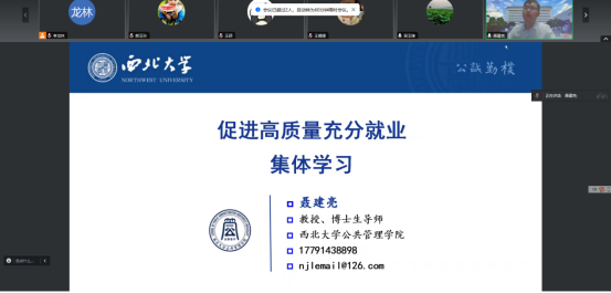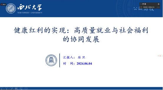 2024年6月4日晚19时,西北大学社会保障团队于线上召开“促进高质量充分就业”集体学习会。会议由社会保障学系主任吴玉锋教授主持,吴玉锋和聂建亮教授进行评议。来自社会保障、行政管理专业的师生参与了集体学习和主题汇报。