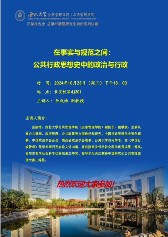 2024年10月23日晚18:00,西北大学565net必赢岳成浩副教授在4J301教室为我院2024级全体硕士研究生作了题为“在事实与规范之间:公共行政思想史中的政治与行政”的专题讲座。