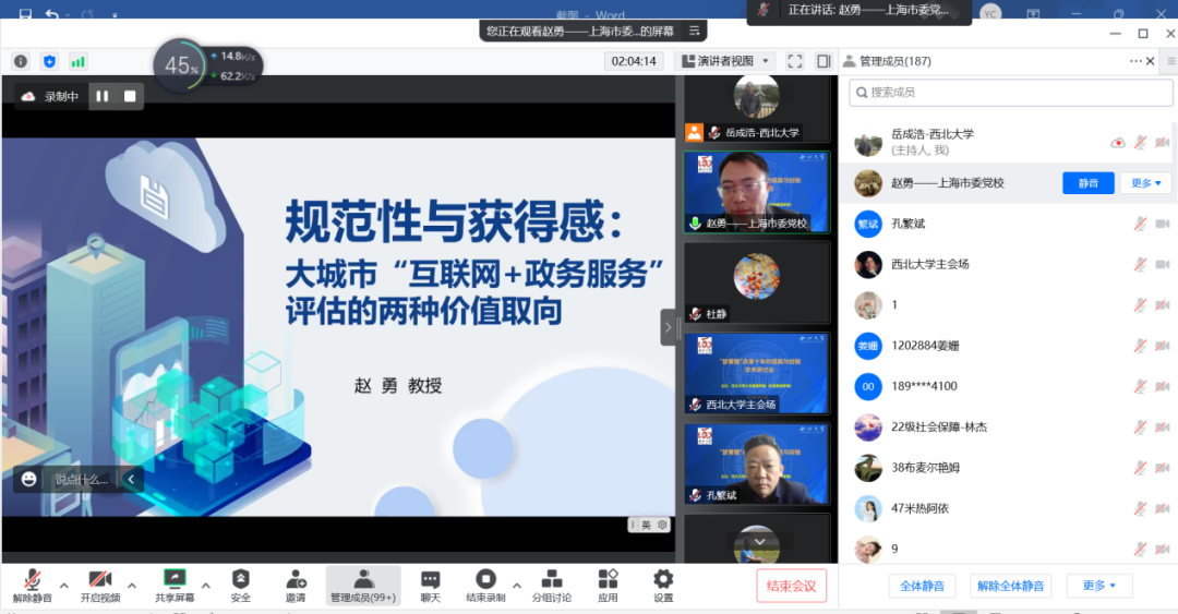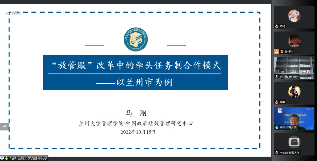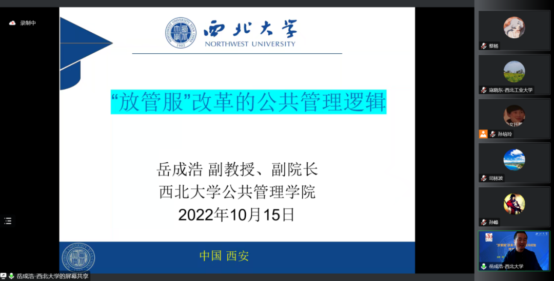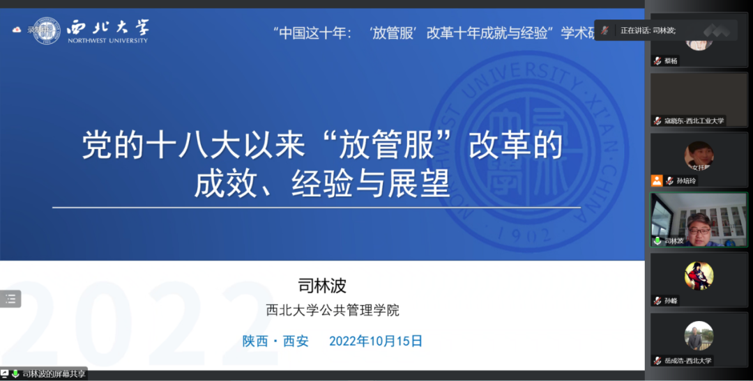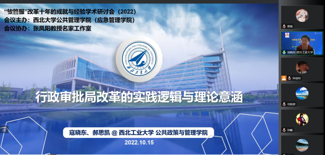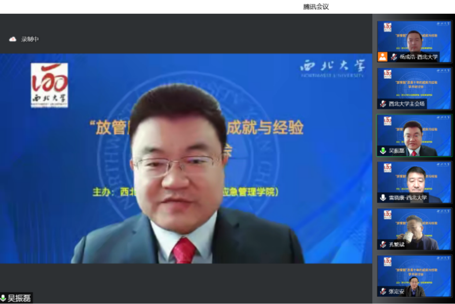 2022年10月15日,由565net必赢客户端主办、张凤阳教授名家工作室协办的“‘放管服’改革十年的成就与经验学术研讨会”借助腾讯会议在线成功举办。来自中国行政管理学会、南京大学、上海市委党校(上海行政学院)、江苏省委党校(江苏行政学院)、天津师范大学、中国人民大学、西北大学、陕西师范大学、西北工业大学、四川大学、山东大学、兰州大学、郑州大学、湖南大学、华东政法大学、南京理工大学、南京航空航天大学、中南大学、中国人民公安大学、中南财经政法大学、黑龙江大学、新疆大学、福建师范大学、山西财经大学、西北政法大学、重庆师范大学、西南民族大学、山东师范大学、中国地质大学、包头医学院、宝鸡文理学院、吉林财经大学、广东外语外贸大学、上海海关学院、西安思源学院、中央党校、甘肃省委党校等近40所高校与科研单位的200多名师生在线参加了本次研讨会。