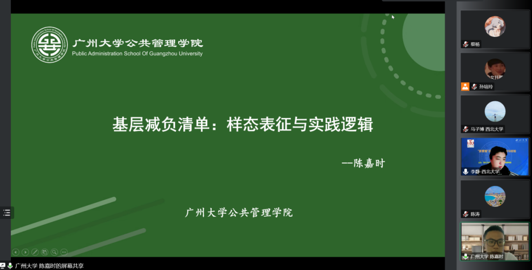 广州大学南方治理研究院陈嘉时研究助理汇报作了题为“基层减负清单:样态表征与实践逻辑”的主题报告。第一部分是问题的提出;第二部分是文献评述,他从职能部门管理、市场治理领域、社会治理领域三个角度进行了综述;在第三部分,他介绍了的资料收集和研究设计;第四部分是基层减负清单的样态表征,他围绕减负清单类型维度、减负清单对象维度、减负清单的发布主体维度进行了讲述;第五部分是基层减负清单的实践逻辑,陈嘉时老师主要讲了信息识别与整合治理:整合性减负的创新技术机制,信息公开与跨级下沉:减负信息的精准化传递,刚性制约与柔性调整:政令下发与基层执行的衔接创新,标准设立与权责界定:规范性减负的作用机制这四点内容;最后他对本次汇报发言做了结论总结和讨论。