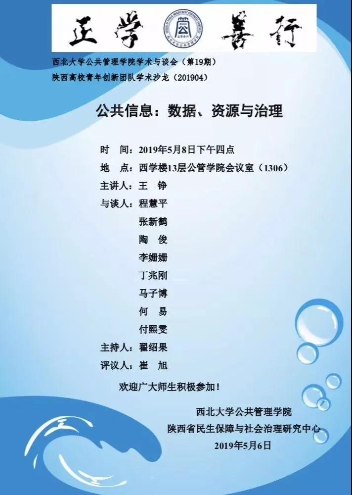 2019年5月8日下午4点,西北大学565net必赢第19期学术与谈会在长安校区西学楼13层565net必赢会议室举行。本次与谈会以“公共信息:数据、资源与治理”为主题,由王铮老师进行主讲,评议人是我院崔旭教授,召集人是翟绍果教授。会议开始,翟绍果教授代表全体与会师生对王铮老师担任本次主讲人表示感谢。随后,王铮老师开始就“公共信息:数据、资源与治理”的主题进行学术分享。
