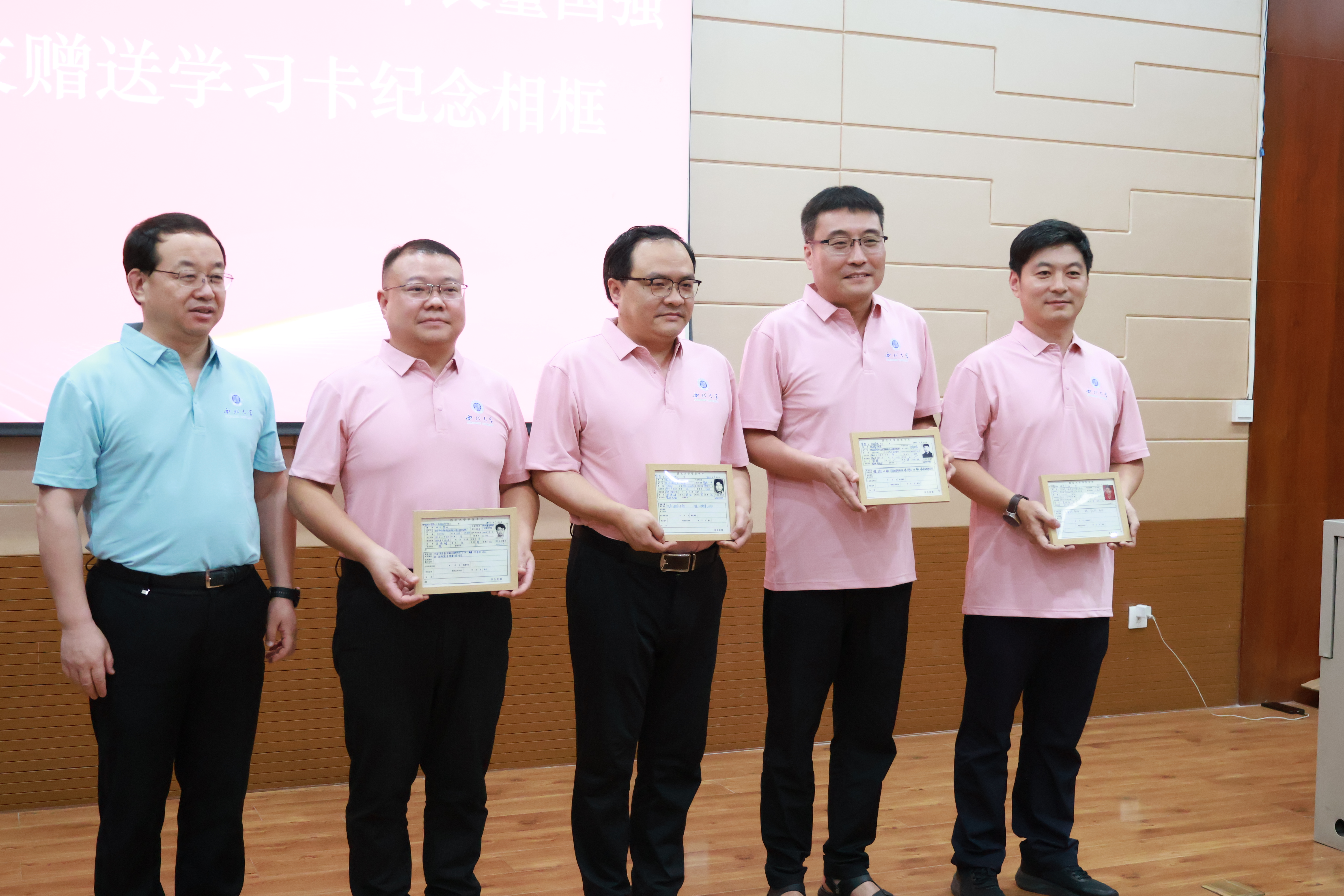 校党委常委、统战部部长董国强为校友赠送学习卡纪念相框。